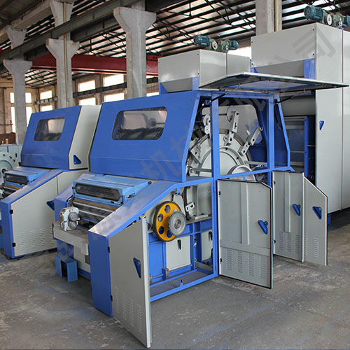 本機主要適用于山羊絨、兔絨、牦牛絨、蠶絲、化纖等散纖維,適紡纖維長度為16-80mm。將電子稱重喂毛機均勻送來的纖維層進行開松和梳理,使所有呈卷曲,塊狀的纖維理成基本伸直的單纖維狀態(tài),后經(jīng)剝網(wǎng)圈條供后道工序使用。