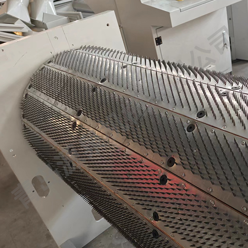 把纖維、原料經(jīng)喂入平簾輸送至喂入羅拉,再由開(kāi)松輥高速開(kāi)松后,經(jīng)輸棉風(fēng)機(jī)以適量的風(fēng)量輸送纖維原料供后遞工作使用。經(jīng)本機(jī)開(kāi)松后的纖維、原料效果好,均勻、細(xì)致。
